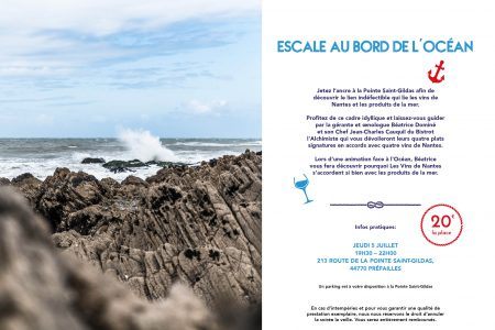 Trois expériences uniques, en format afterwork de 19h30 à 22h, rythmées par la découverte d’accords mer et vins singuliers orchestrés par trois Chefs Nantais : le binôme Jean-Charles Cauquil et l’œnologue Béatrice Dominé du Bistrot l’Alchimiste, James Fermigier de l’Auberge du Val de Loire et Mathieu Pérou du Manoir de la Régate.