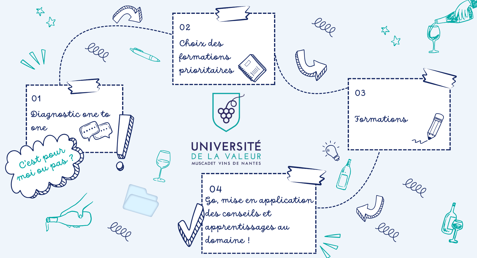 L’Université de la valeur se déroule en 4 étapes : le diagnostic, le choix des formations, les formations et la mise en pratique.